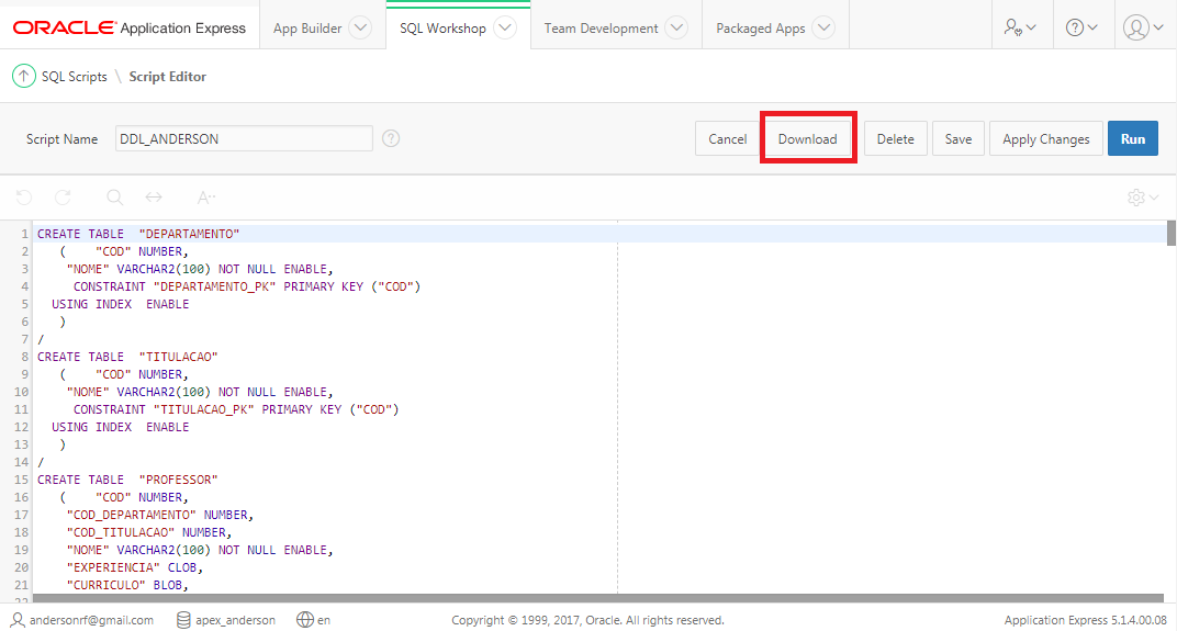 Observação: Ao clicar em "Create Script", a geração do script pode ser uma operação bem lenta. No ambiente do apex.oracle.com é tão lento que as vezes dá timeout!!! Aparentemente a lentidão é maior quanto maior a quantidade de objetos no banco todo.